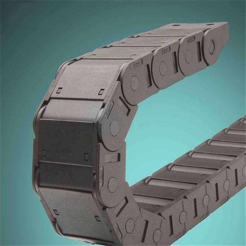 (3)單元鏈節由左右鏈板和上下檔板(橋式)或蓋板(全封閉式)組成,拖鏈每節都能打開,裝拆方便,不必穿線,打開蓋板后即可把電纜、油管、氣管、水管等放入拖鏈。